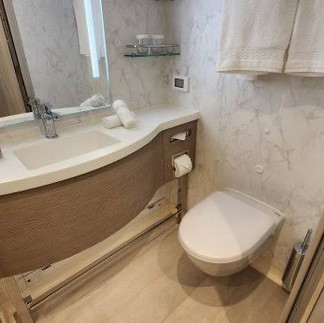 The real game-changer, though, is the luxurious suite, 3/4 times the size of cabins offered by other lines. Your suite includes a separate lounge and bedroom area, a walk-in robe, a massive marble bathroom with a separate shower and bath, and a balcony with full-length loungers.